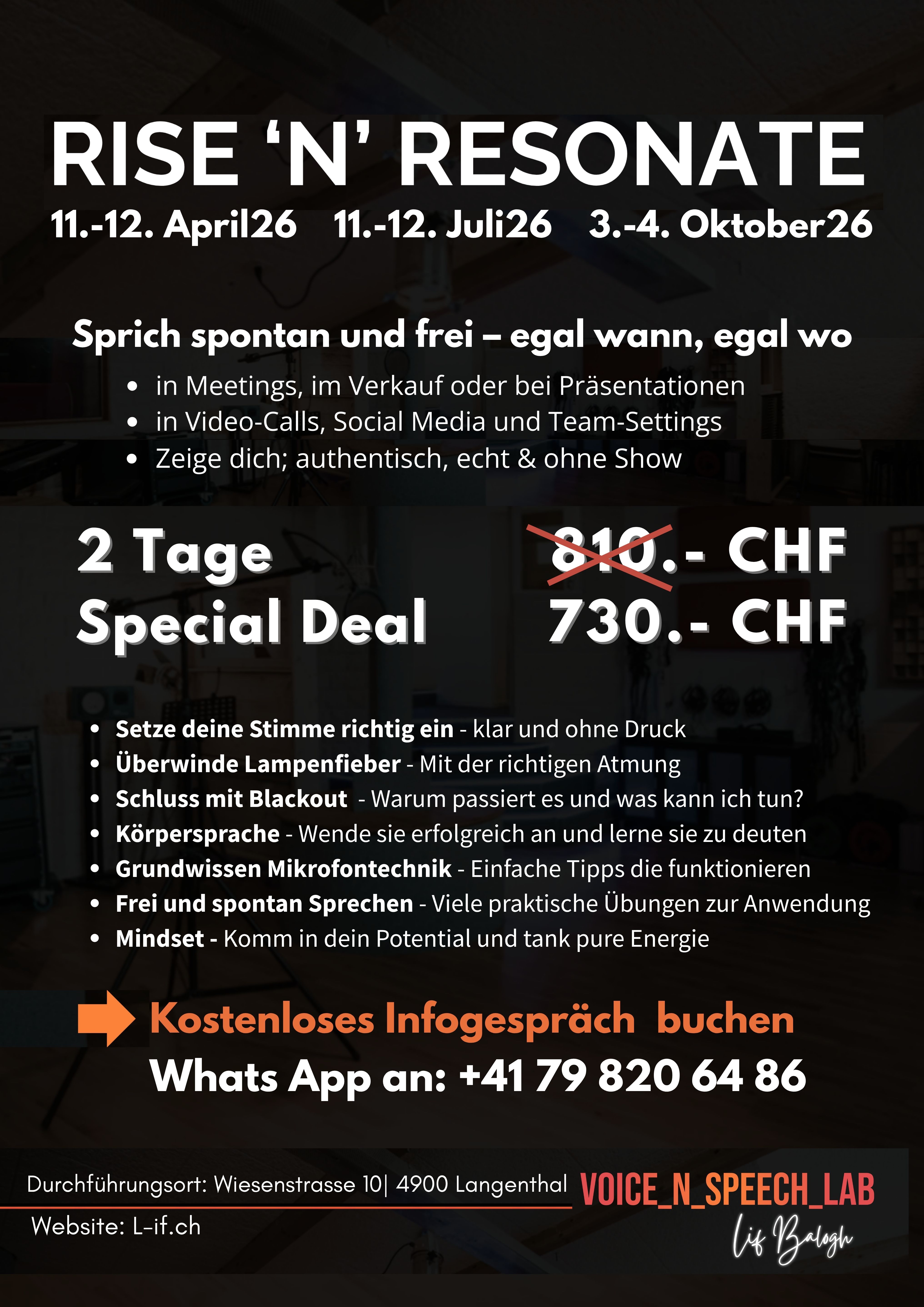 Lerne, sicher und ausdrucksstark zu sprechen – für Reden, Keynotes, Meetings oder den Alltag. Hier lernst du deinen Stimmklang zu verbessern, deine Atmung bewusst einzusetzen, eine klare Artikulation & selbstbewusste Präsenz.